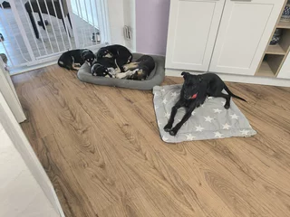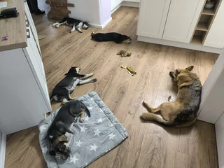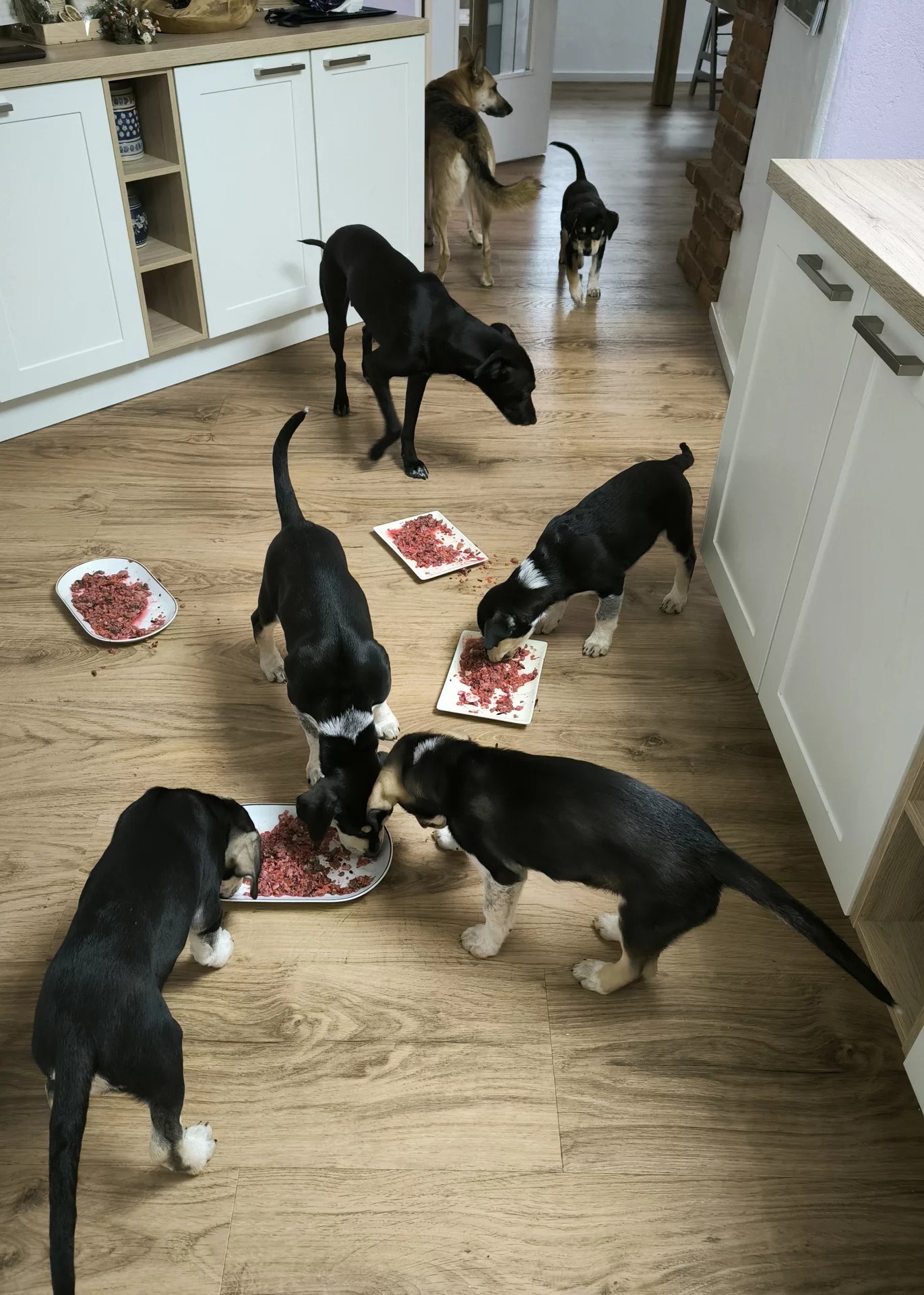 Im Oktober 2024 sicherten wir, gemeinsam mit Andrea Mittermeir von der Allianz der Tier und Naturfreunde e.V. und Catch Hundesicherung, eine freilaufende Hündin im Landkreis FFB. Schnell war ersichtlich, dass diese Hündin Welpen hatte und wir machten uns auf die Suche nach ihnen. Mit Hilfe vieler fleißiger Sichter, konnten wir ihren Aufenthaltsort einschränken und fanden nach kurzer Suche fünf wenige Tage alte Welpen. Der Gesundheitszustand von Mandarinchen, wie sie zwischenzeitlich von meiner Tochter getauft wurde, war entsprechend der Strapazen die sie durch gemacht haben muss, sehr angeschlagen und so entschieden wir uns die Hundefamilie bei uns aufzunehmen. Zwischen Oktober und März hatten wir ein volles Haus und durften alle auf ihrem Weg bis hin ins neue zu Hause begleiten.